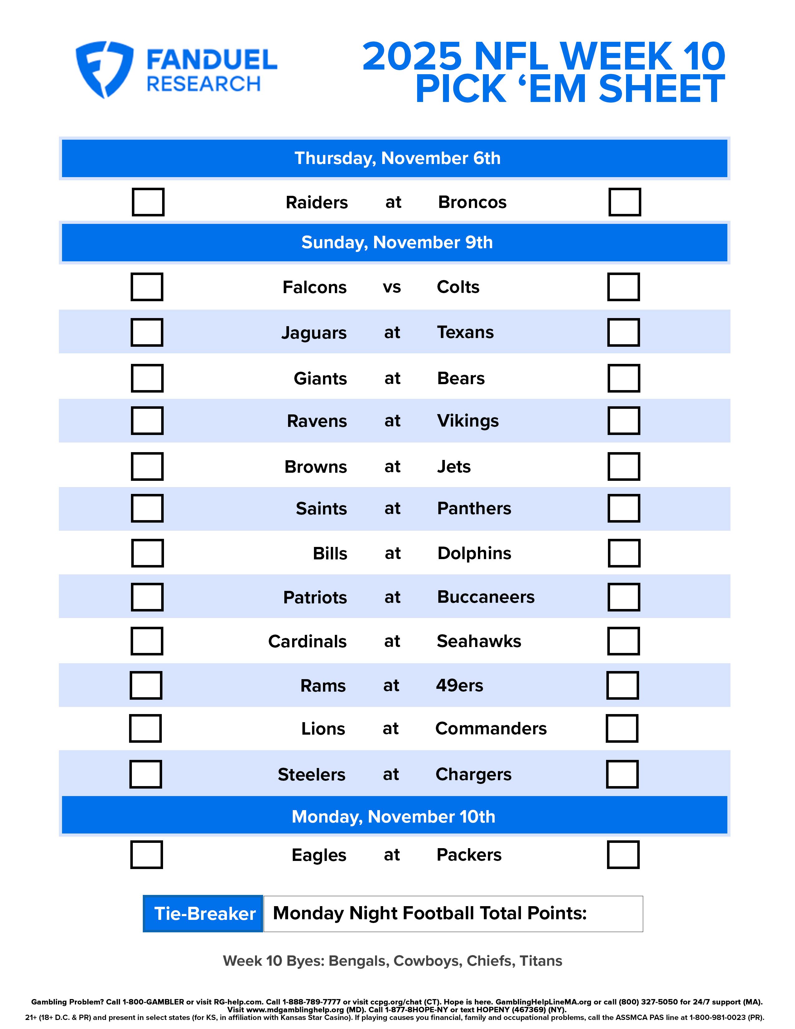 Download the Week 10 printable NFL Pick 'Em Sheet here.