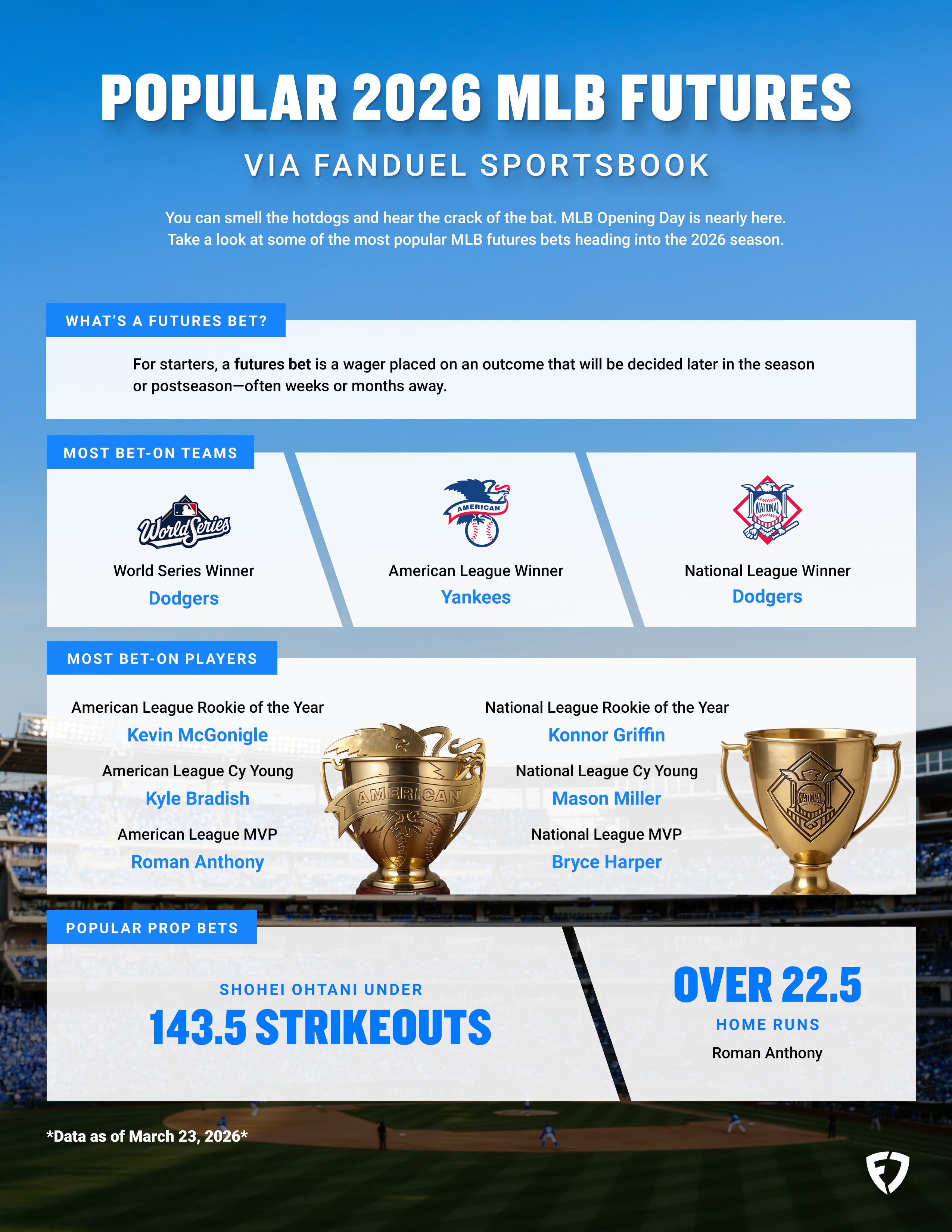 You can smell the hotdogs and hear the crack of the bat. MLB Opening Day is nearly here. Take a look at some of the most popular MLB futures bets heading into the 2026 season.