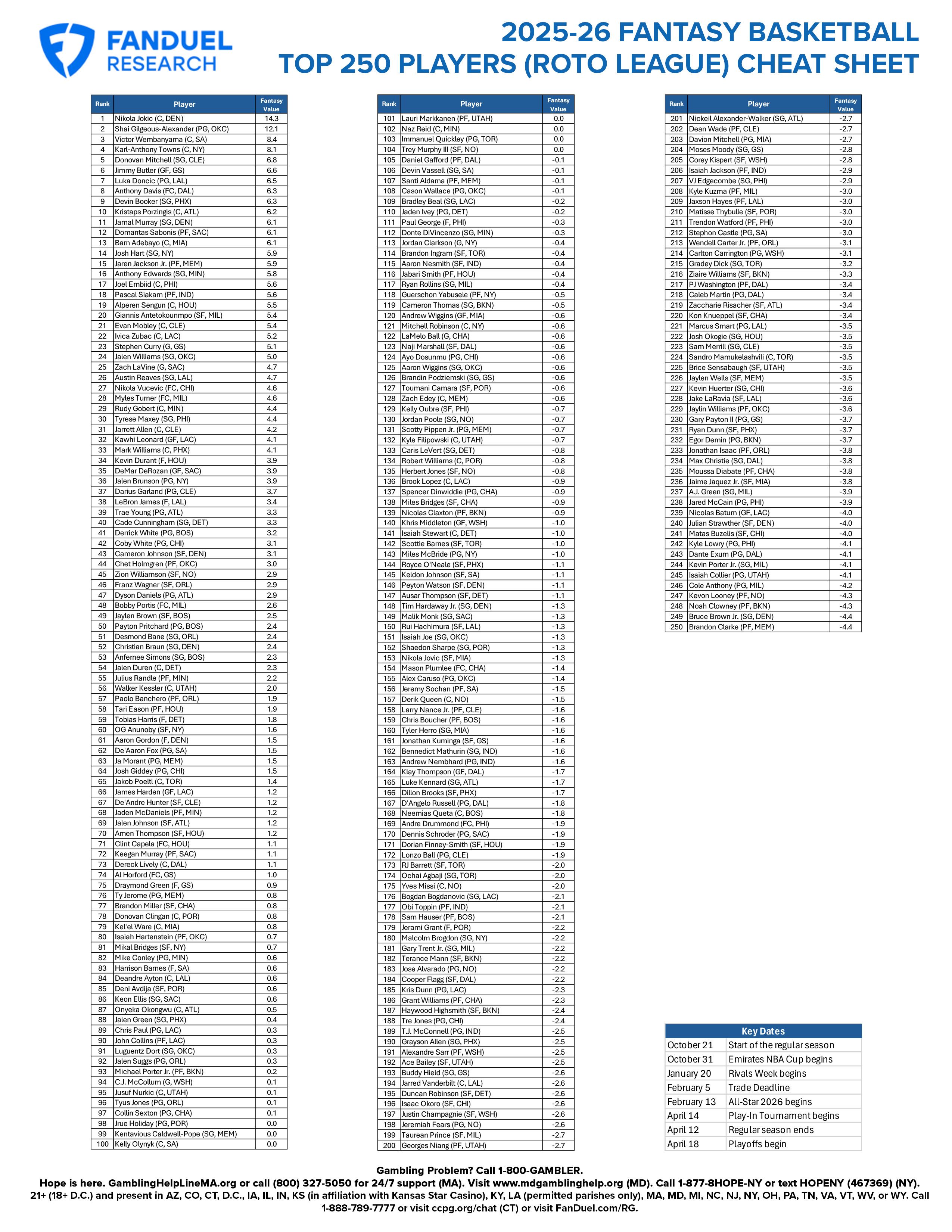 Fantasy Basketball Printable Cheat Sheet: Top 250 NBA Rankings for 2025-26 Roto League