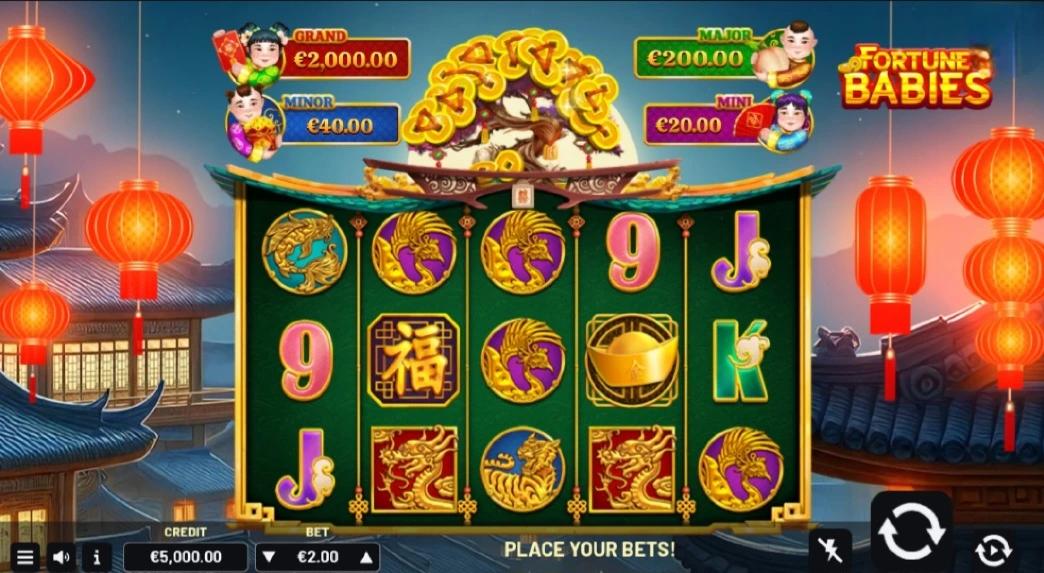 Jackpot panels show prizes in bright boxes at the top. Each tier has a fortune baby. These characters give the theme personality and humor. The title logo is golden beside the jackpot display. It draws players in without cluttering the UI.