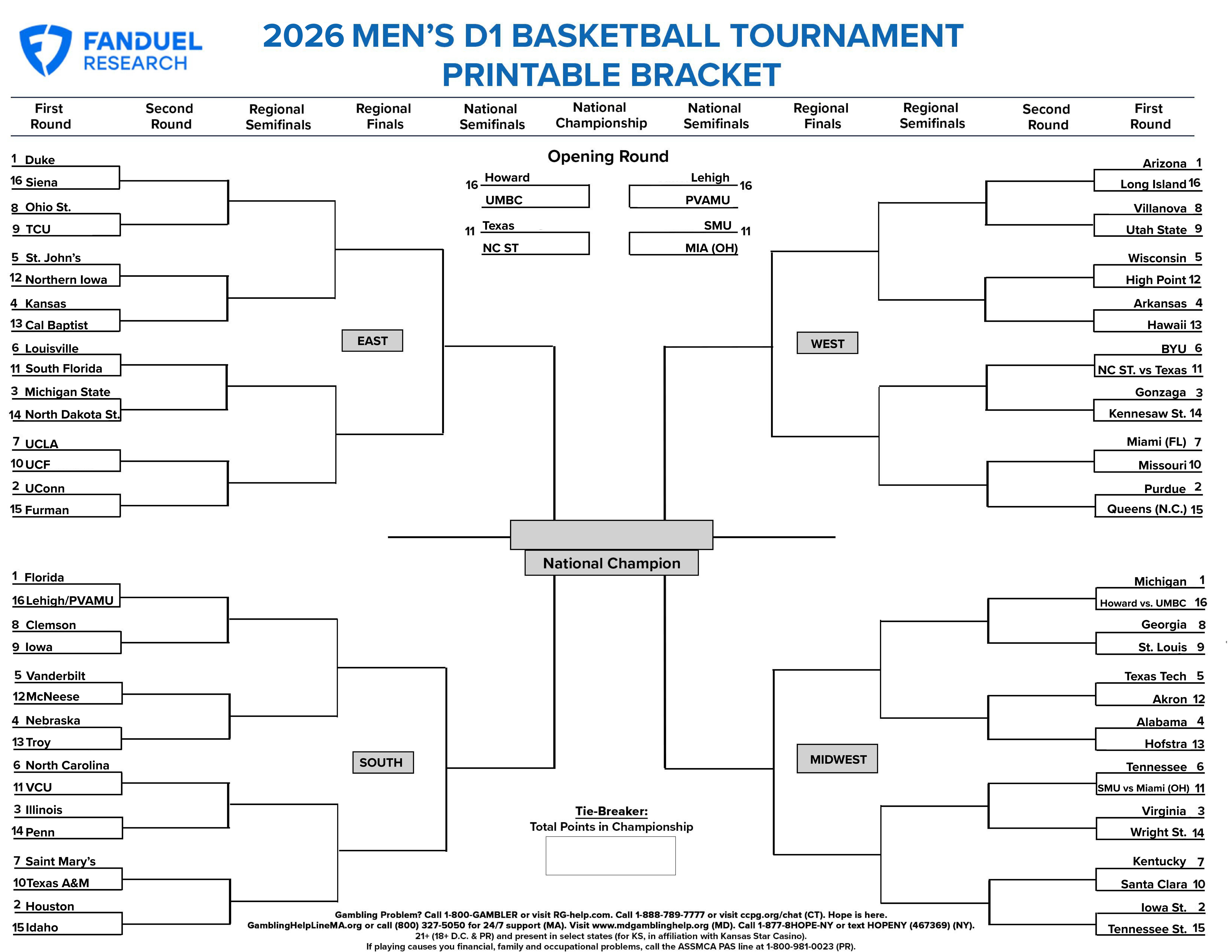 March Madness: Printable Bracket for the 2026 Men's NCAA Tournament