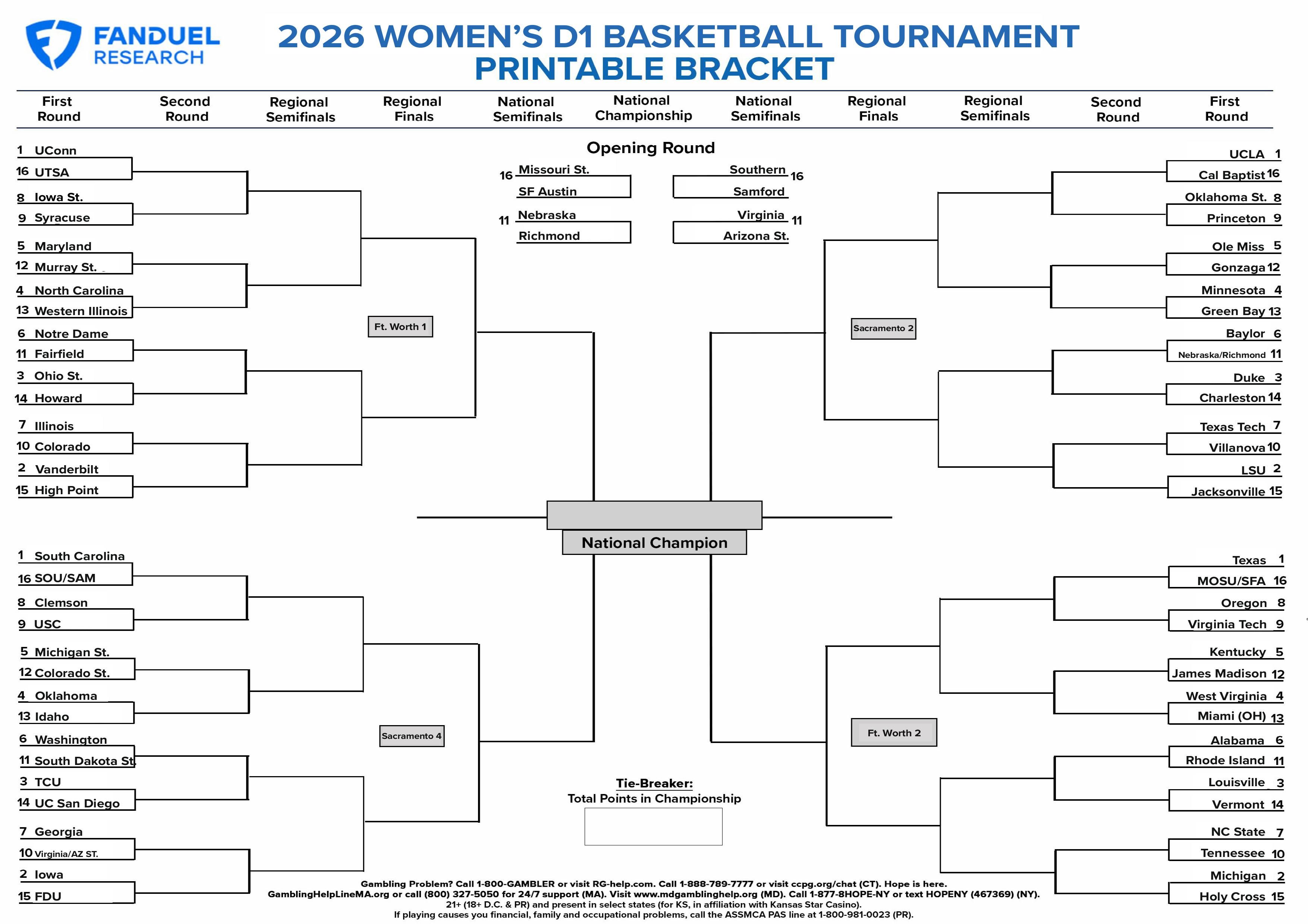March Madness: Printable Bracket for the 2026 Women's NCAA Tournament