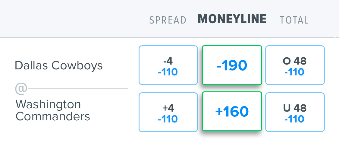 Let’s say the Dallas Cowboys are playing and they’re the favorite over the Washington Commanders. You might see: